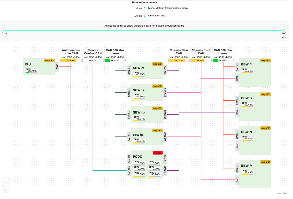 The chart shows the interconnections, and percentage occupancy of each core of the ECUs, and networks involved in the simulation. Each occupancy is flagged with a specific color, to highlight potential problems linked with resource occupancy.