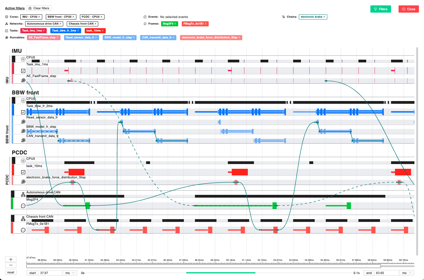 Failing event chains are shown with a dotted line, and, by clicking on the line, it is possible to get more details about it. The gantt chart shown by clicking on the action button near an event chain, abstracts all the information about the simulation to focus on the specific timing requirement. However, it is possible to get the whole simulation data by clicking the “Show Timing Gantt” button.