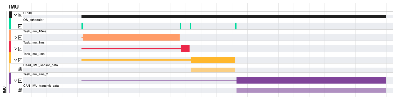 In the picture above, Task_imu_2ms stays in ready state as Task_imu_10ms and Task_imu_1ms have higher priorities, and then transition ready when the aforementioned tasks terminates execution. This interaction is shown in the gantt with a single yellow line, followed by the yellow rectangle.