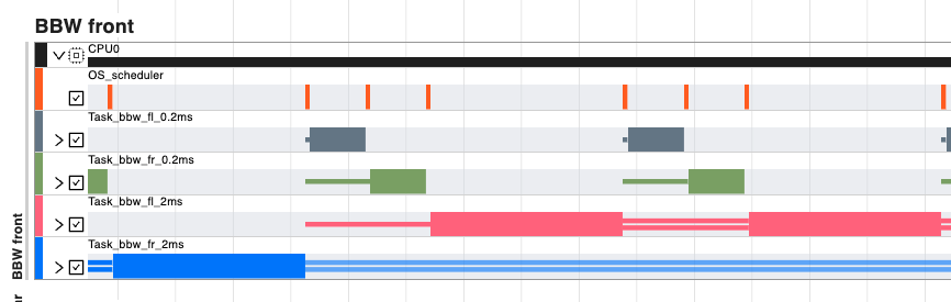 In this second example, it is observable how Task_bbw_fl_2ms gets preempted by the Tasks ad 0.2ms. In this case the interaction is shown with double lines.