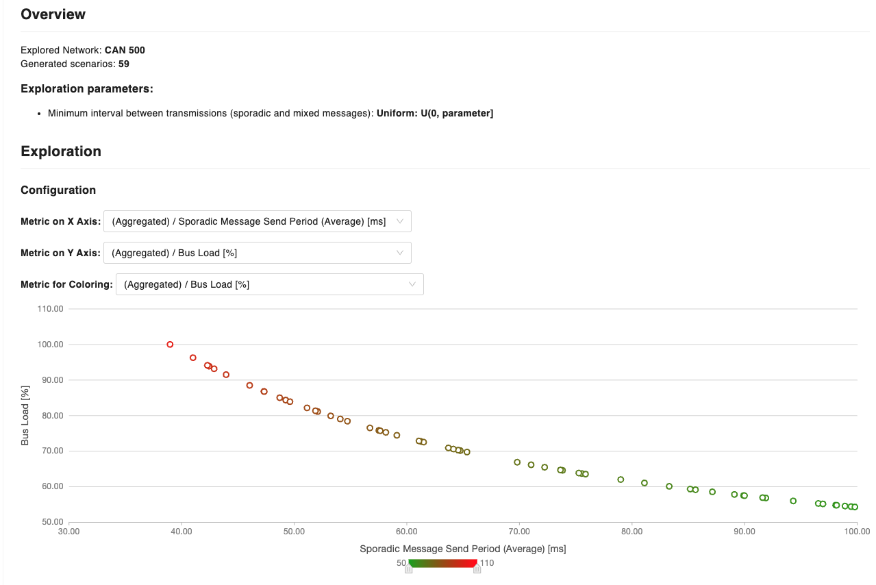 The generated chart is configurable as you have the opportunity to customize the information by modifying the x and y-axis. In the example above, the chart has been configured with the average sporadic/mixed message send period in ms on the x-axis, while the y-axis shows the % bus load. Furthermore, a metric for coloring has been indicated to show how the bus load increases with the increase of the delivery frequency of messages. Each point of the chart, corresponds to a scenario, where messages have been sent with the average period defined in the x-axis. For each scenario (data point), it is possible to obtain detailed information at the message granularity (by obtaining the Response Time Analysis and Relative response time violations charts)