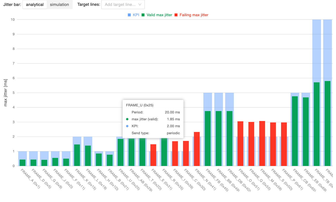 Hovering on a specific message it is possible to get its details: its period, its analytical maximum jitter and the simulated maximum jitter at the specified percentile.