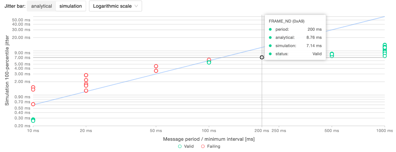 This chart allows to validate the reliability of the network in terms of stability for each message period. In the chart, every point corresponds to a message. On the x-axis there are increasing message periods (or minimum transmission intervals for non-periodic messages), while the y-axis provides the maximum jitter time in ms. The set boundary for the maximum acceptable jitter is represented by a line that separates messages within such a boundary, represented as green points, from messages violating it, represented as red points. In order to better accommodate a wide range of jitter values, it is possible to choose the type of visualization scale (linear or logarithmic). In the example above, information is reported in logarithmic scale, and the maximum jitter is set to be 6% of the period of the messages.