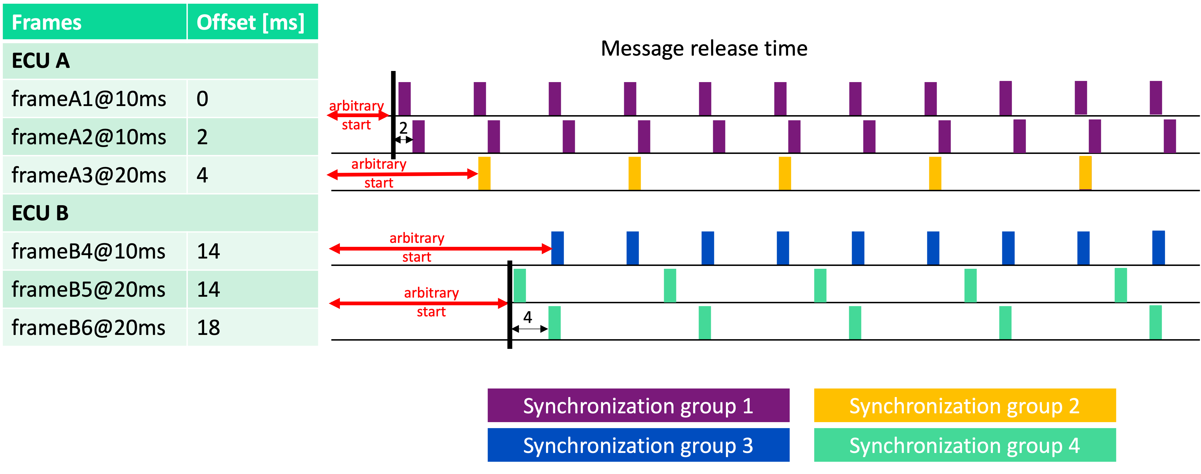 Enabling Inter-ECU synchronization (“Synchronize ECUs” switch), ECUs are assumed to enable the communication stack in the exact same instant, leading to messages having the same period across all the ECUs to fall in the same synchronization group.