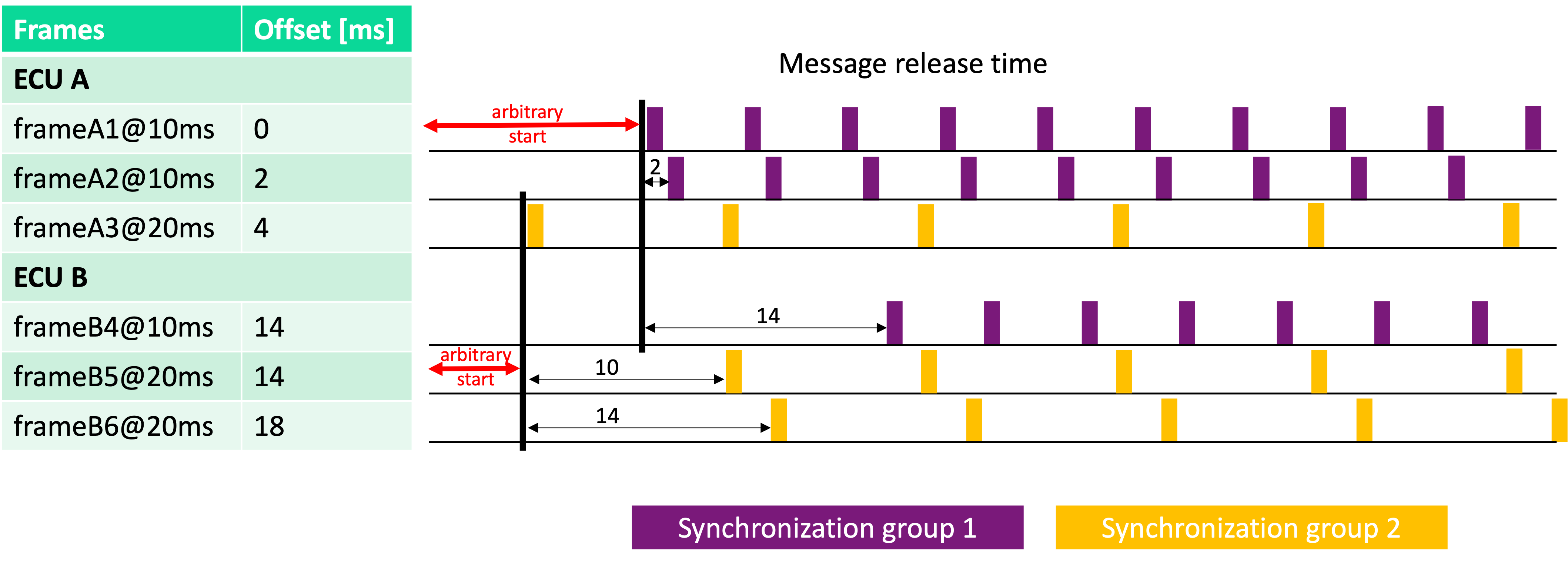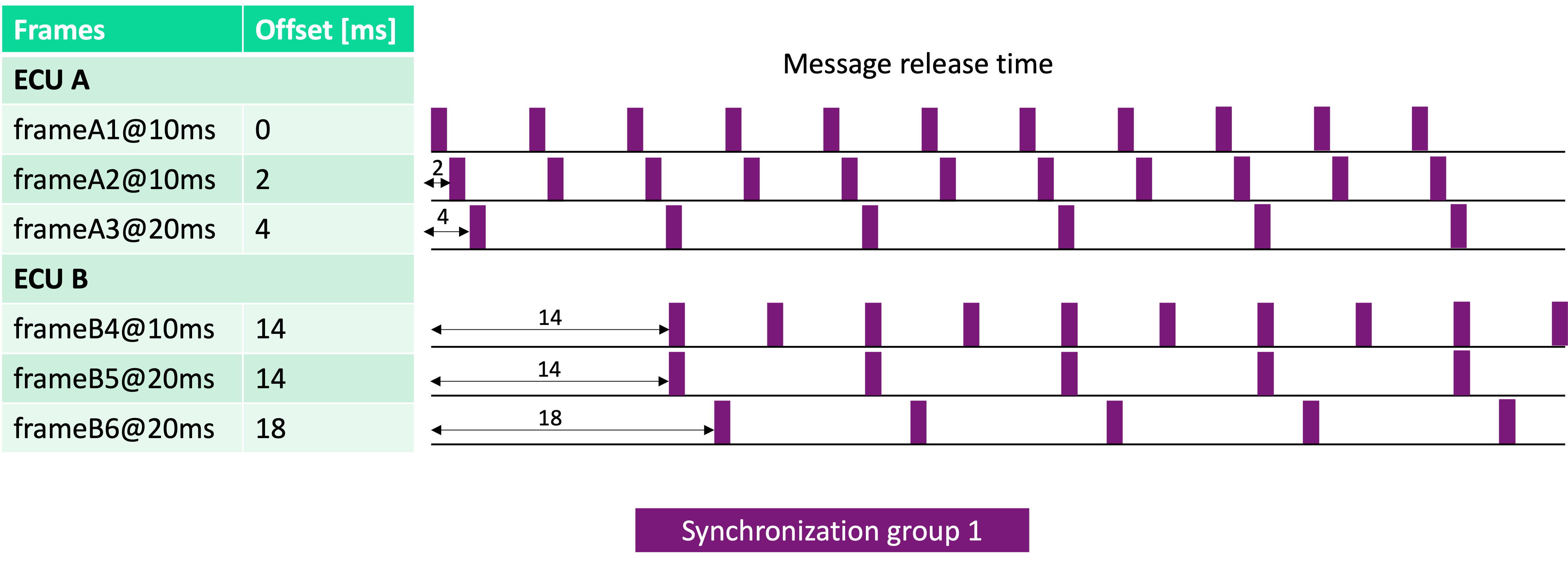 As an example, consider two ECUs with 3 messages each, each of them with a specific offset. Enabling both “Synchronize ECUs” and “Synchronize different message periods” results as follows: