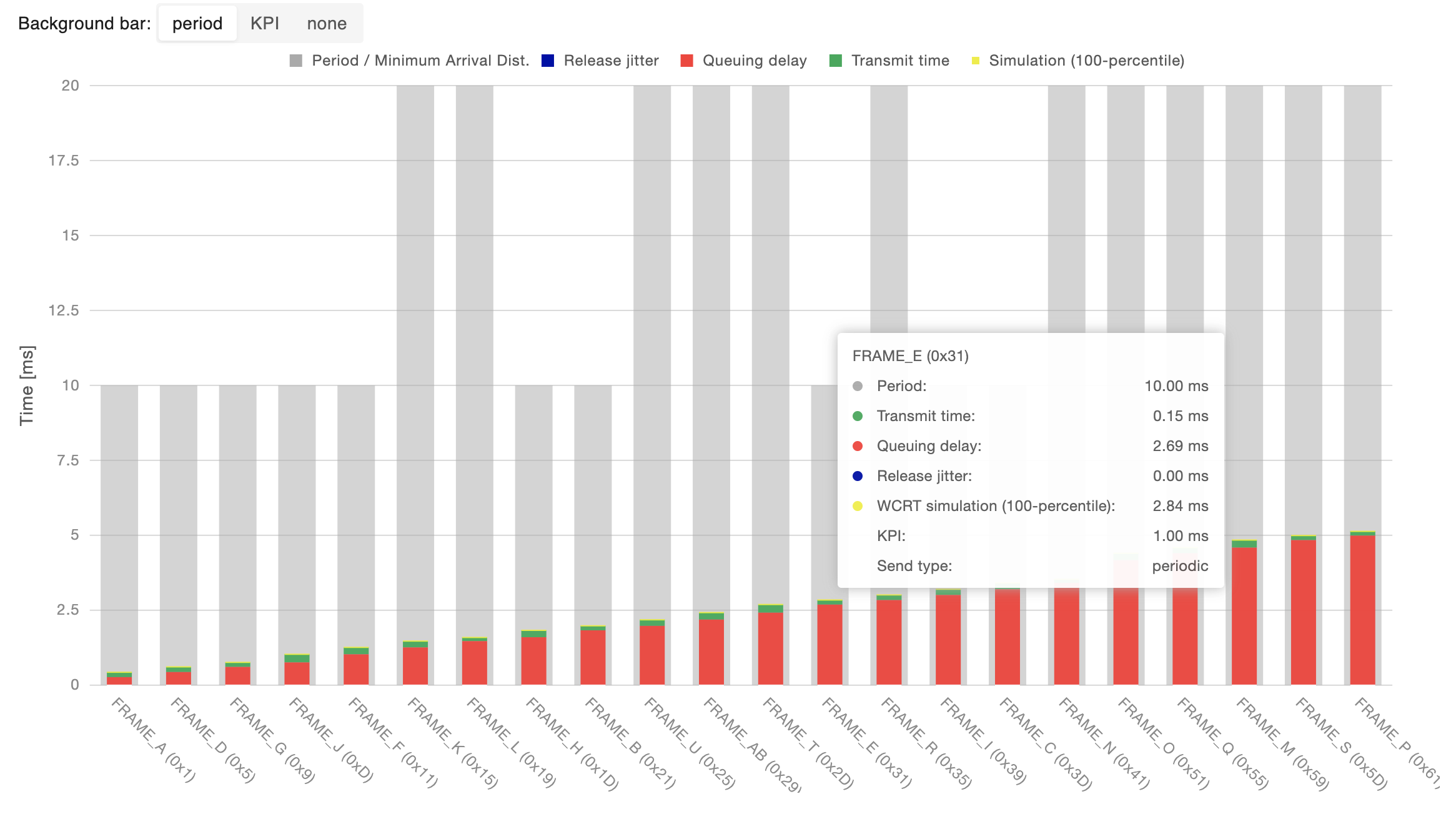 To further inspect the composition of the WCRT summarized in the previous charts, it is possible to analyze the breakdown of the analytical WCRT for each message into its components possibly comparing the result either with the message period/minimum transmission interval or the set KPI boundary on its WCRT.