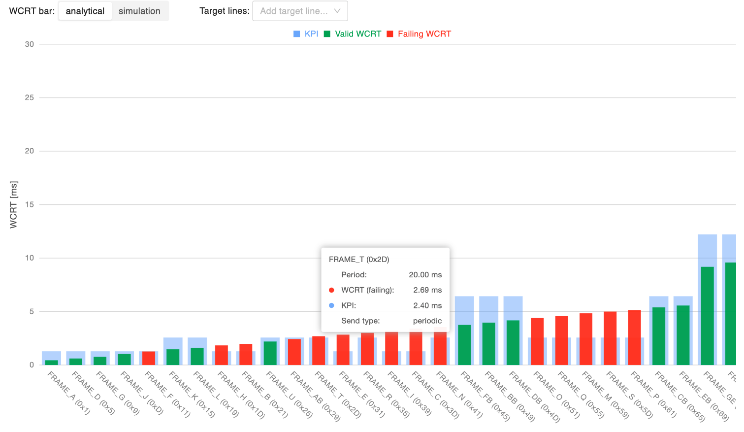 This chart shows the WCRT for each message, allowing to identify messages that experience excessive response time, which may reduce the reliability of the network and result in potential actual/expected message periodicity inversions. On the x-axis of the chart there are increasing message identifiers (lower priority last), while the y-axis provides the WCRT time in ms. By setting a boundary for the maximum acceptable WCRT (as a percentage of the message period, or minimum transmission interval, for non-periodic messages), messages within the boundary are represented with a green bar, messages violating it with a red bar.