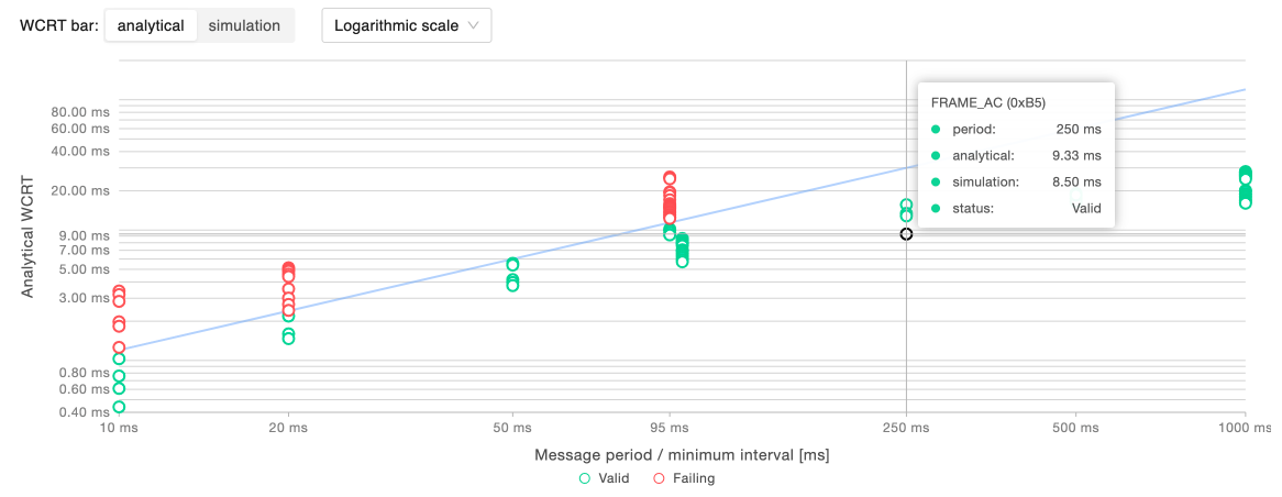 This chart allows to validate the reliability of the network in terms of stability of latency for each message. In the chart, every point corresponds to a message. On the x-axis there are increasing message periods (or minimum transmission intervals for non-periodic messages), while the y-axis provides the WCRT time in ms. The set boundary for the maximum acceptable WCRT is represented by a line that separates messages within such a boundary, represented as green points, from messages violating it, represented as red points. In order to better accommodate a wide range of WCRT values, it is possible to choose the type of visualization scale (linear or logarithmic). In the example above, information is reported in logarithmic scale, and the max WCRT is set to be 25% of the period of the messages.