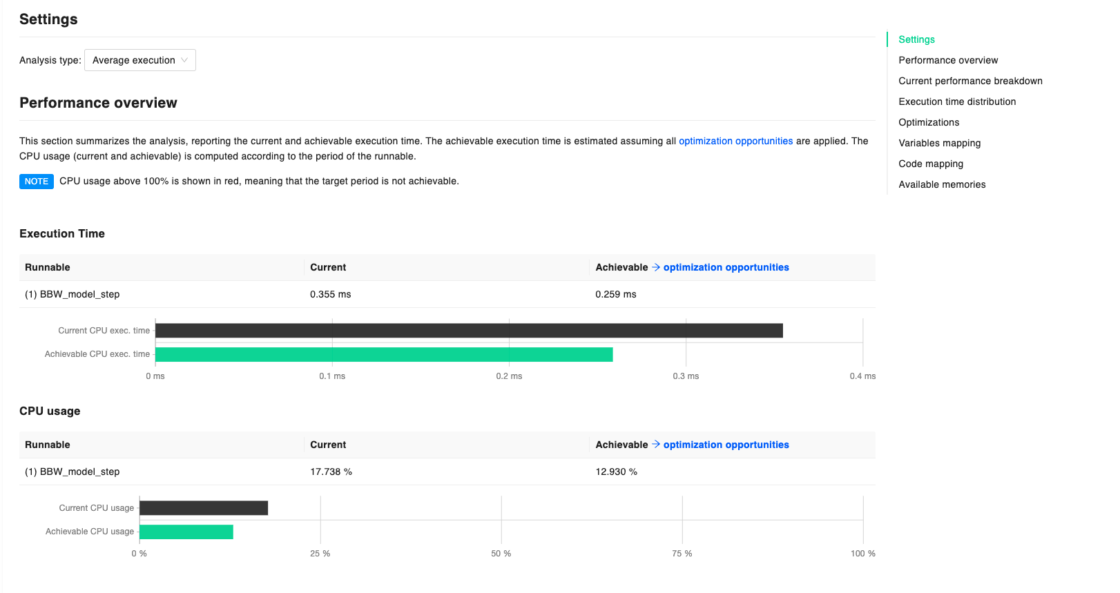 The section summarizes the analysis, reporting the current (in black) and achievable (in green) execution time. Achievable execution time is estimated assuming that all the Optimization opportunities are applied to the code. Data regarding CPU usage (both current and achievable) is computed according to the period of the runnable either specified by hand or collected by the Huxelerate utility during the HPORF generation.