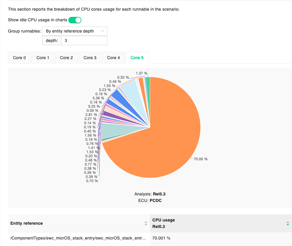 The overview provides current and achievable CPU usage per each core of the analyzed ECU Type, while the breakdown provides more detailed information on resource occupancy of each periodic runnable. In the second section of the report, it is possible to group runnables to get resource usage information of groups of software (e.g. Autosar compositions).